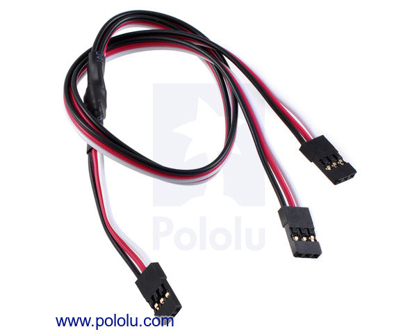 This 12-inch (300-mm), flat Y-cable can be used to split a single RC hobby servo signal into two identical outputs. It has 22-AWG wires terminated on all three ends by “JR”-style female connectors, which are compatible with 0.1" header bins and both male JR and male Futaba J connectors. The split occurs close to the cable’s input, so the two output ends can be separated by up to approximately 18" (450 mm). The cable’s conductors each consist of 60 strands, making it more flexible than standard servo cables.