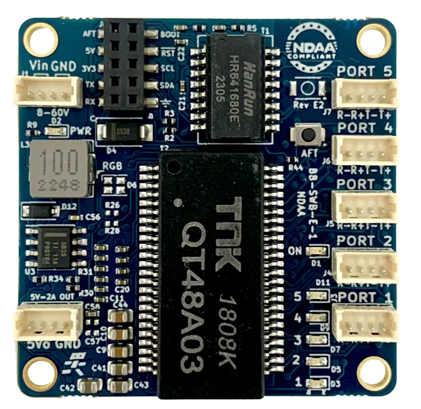 SwitchBlox, כעת תואם לתקן EO13981 ו-NDAA SwitchBlox NDAA הוא מתג האתרנט הסטנדרטי שלנו בעל 5 פורטים בטווח 10/100M, אך עם שרשרת אספקה המבוססת מחוץ לארבע המדינות היריבות המפורטות בצו נשיאותי EO13981 (אלה הן איראן, רוסיה, סין וצפון קוריאה). לוח זה הוא חלק מהשלב הראשון שלנו להתרחק משרשרת אספקה שבסיסה בסין, כדי לענות על צרכי לקוחותינו אשר חייבים להבטיח תאימות לתקן NDAA ו-EO13981 במערכות ה-UAS שלהם. קראו עוד על מאמצינו כאן. הלוחות מיוצרים בתאילנד השבבים הפעילים מגיעים מ-Digi-Key, Mouser או ישירות מהמפיצים האירופיים שלנו השבבים הפסיביים מגיעים רק מ-Digi-Key או Mouser כל הרכיבים הפסיביים מגיעים מ-Digi-Key או Mouser. לוח זה מאפשר ללקוחותינו לבנות מערכות UAS תואמות NDAA ו-EO13981 ללא עבודה נוספת. אנו מסוגלים לספק תעודת תאימות מלאה, רשימת חומרים והצהרות עקיבות כדי להבטיח זאת. שימו לב, אין הבדל עיצובי בין לוח זה לבין ה-SwitchBlox הסטנדרטי שלנו. לגיליונות נתונים ומפרטים טכניים, אנא עיינו במידע בדף ה-SwitchBlox הסטנדרטי שלנו. SwitchBlox הוא מתג אתרנט קטן עם חמישה פורטים של 10/100MB, שתוכנן במיוחד עבור סביבות רועשות ומוגבלות במקום. עם גודל כולל של 44.5 מ"מ (1.75 אינץ') על 44.5 מ"מ (1.75 אינץ'), SwitchBlox הוא מתג הרשת הקטן ביותר בעולם, מה שהופך אותו למושלם עבור רובוטים, רחפנים או כל יישום רשת מוגבל במקום. שימו לב כי מכיוון שלוחות אלה מיוצרים כעת לפי הזמנה, זהו מוצר שאינו ניתן לביטול ולהחזר כספי (NCNR).