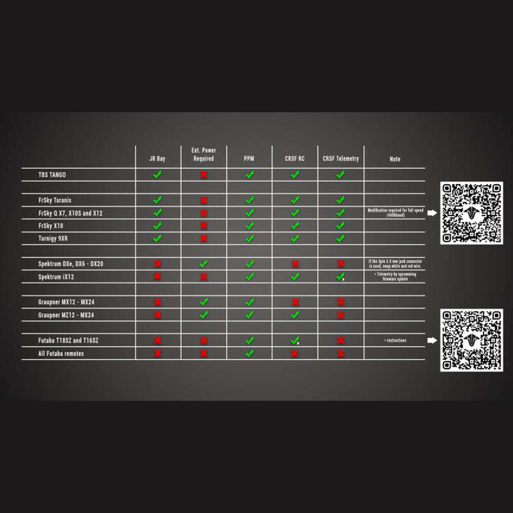 - ניתן להגדרה מלאה על ידי OpenTX ו-TBS TANGO מרחוק באמצעות פרוטוקול CRSF